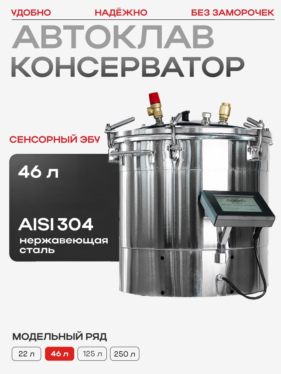 Объём 46 литров позволяет загружать до 40 банок по 0,5 л или 12 банок по 1 л за один цикл. Удобно работать как со стандартными стеклянными банками, так и с жестяными консервными банками и реторт-пакетами. Это даёт возможность делать универсальные заготовки: от мясных тушёнок до соков, овощных салатов и компотов.