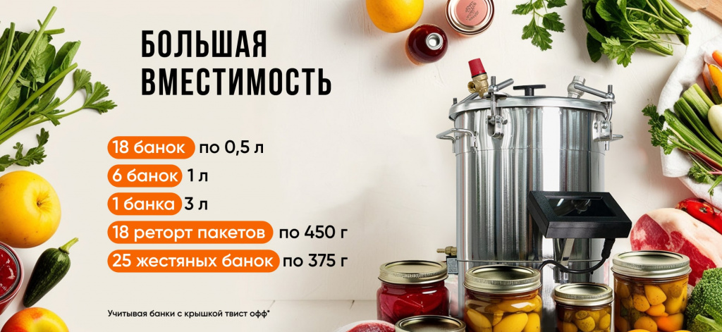 Объём 22 литра позволяет загружать до 18 банок по 0,5 л или 6 банок по 1 л за один цикл. Удобно работать как со стандартными стеклянными банками, так и с жестяными консервными банками и реторт-пакетами. Это даёт возможность делать универсальные заготовки: от мясных тушёнок до соков, овощных салатов и компотов.
