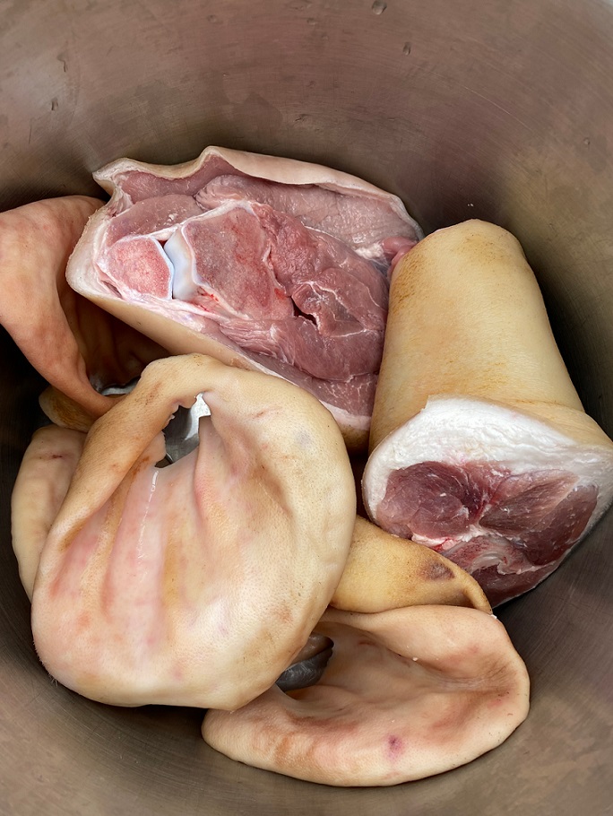 - Сварить холодец из свинины. Добавляем рульку, ножки, уши и окорок, лук, морковь, чеснок, лавровый лист, черный и душистый перцем горошком. Варить 5 часов.